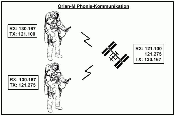 Anfang der 70er Jahre entwickelte die russische Firma Zwesda einen Raumanzug für den Außenbordeinsatz auf der Mondoberfläche mit Namen Orlan (dt.Adler), für das damalige sowjetische Raumfahrtprogramm. Da man das bemannte Mondprogramm der Sowjetunion im Jahr 1971 eingestellt hatte, wurden die Orlan-Raumanzüge für Ausstiege in den Weltraum von den Saljut Raumstationen modifiziert und kamen bis zum Ende der Nutzung von der Raumstation MIR insgesamt 94-mal zum Einsatz. Die erste Verwendung eines Orlan-Raumanzuges auf der ISS fand am 08.Juni 2001 während einer IVA (Intra-Vehicular Activity, dt. Innenbordaktivität, im luftleeren Raum) statt. Die russischen Orlan-Raumanzüge haben gegenüber den amerikanischen EMU-Raumanzüge den Vorteil, daß sie bei einen höheren Innendruck von 0,4 Atmosphären operieren können. Der Raumfahrer braucht somit nur eine Kompression von ca. 30 Minuten einzuhalten, bis er in den Weltraum aussteigen kann. Durch den höheren Innendruck besteht aber auch der Nachteil einer weniger guten Bewegungsfreiheit. Maximal kann ein Orlan-Raumanzug ~9 Stunden eigenständig funktionieren. Die heutigen Modelle können bis zu 15-mal innerhalb eines Zeitraums von 4 Jahren verwendet werden. Die Orlan-Raumanzüge nutzen die analogen VHF Phonie-Kommunikationssysteme Woßchod-M und Korona-M vom russischen Teil der ISS. Daher ist es auch möglich die Kommunikation direkt beim Überflug auf den VHF-Frequenzen zu empfangen.