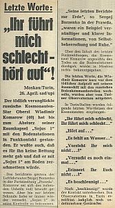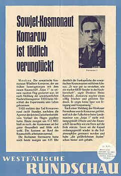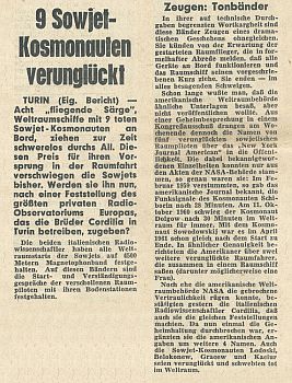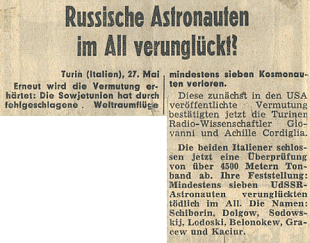 Letzte Beobachtung und Schließung Wohl eine der letzten nachvollziehbaren Beobachtungen der Satellitenbeobachtungsstation "Torre Bert", war der Unglücksflug des Sojus 1 Raumschiffes im April 1967. Kosmonaut Wladimir Komarow der im Oktober 1964 schon einen 1-tägigen Raumflug mit Woschod 1 erfolgreich absolviert hatte, durfte mit diesem neuen Prototypen von einem Raumschiff, den ersten bemannten Testflug durchführen. Schon kurz nach dem Erreichen der Umlaufbahn stellten sich die ersten Probleme ein. Die Mission konnte nicht wie geplant durchgeführt werden. Nach 18 Umläufen wurde daher vorzeitig die Landung eingeleitet, wo es zu einem folgenschweren Unfall kam. Da sich der Hauptfallschirm nicht entfalten lies, schlug die Kapsel fast ungebremst auf den Boden auf, wobei Kosmonaut Wladimir Komarow sein Leben verlor. Nach den Angaben bei Wikipedia: Sojus 1, soll der Kurzwellensender von Sojus 1 nicht fehlerfrei funktioniert haben. Somit war nur eine sichere Kommunikation über VHF und direkt über dem sowjetischen Territorium möglich. M.D.Oslender sowie auch die Sternwarte in Bochum konnten aber z.B. noch vor dem Funk-Blackout bis 04:15 Uhr MEZ, nur ganze 9 Minuten vor der harten Landung, auf 20.008 kHz in AM letzte Funksprüche "Alles in Ordnung! Ich fühle mich wohl." von Wladimir Komarow empfangen. Interessant ist da die scheinbar Gegensätzliche Darstellungsweise von den Brüdern Judica-Cordiglia, welche in der Tageszeitung Mittag vom 25.04.1967 abgedruckt worden ist. Da hatte Wladimir Komarow doch nicht so einen frischen und gelösten Eindruck vor der Landung gemacht, wie es wiederum von der Sternwarte in Bochum berichtet, im Extrablatt der Westfälischen Rundschau vom 24.04.1967 geschrieben steht. (siehe auch: Berliner Zeitung vom 24.04.1967 Komarows Stimmer im "Ohr" ) |