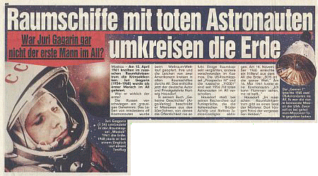 ![]() 02.02.1961 Empfang von einem biomedizinischen Signal. Zu hören war ein Puls (Herzschlag) und eine mühsame Atmung eines scheinbar sterbenden Phantom-Kosmonauten. Später wurde bekannt gegeben, daß am 02.02.1961 ein unbekannter Raumfahrer einen geheimen Raumflug durchgeführt haben soll, der während des Fluges bewusstlos wurde und dabei sein Leben verlor. Am 2.Flugtag im 17.Umlauf wurde das Raumfahrzeug scheinbar automatisch auf fremden Boden notgelandet. Bei diesem empfangenen biomedizinischen Signal gibt es einige Zweifel der Echtheit, da die Satellitenbeobachtungsstation "Torre Bert" die einzige war, welche es empfangen hatte. Die Körperfunktionen der Raumfahrer wie Herzschlag, Atmung, Blutdruck und Elektrokardiogramme, wurden nie über einen Audiokanal gesendet, sondern immer von den Sensoren in elektrische Signale umgewandelt und als Messwertübertragung zum Boden geschickt. Die biomedizinischen Werte wurden über einen Sender mit Namen "Signal", z.B. auf den Frequenzen 19.948 (Wostok-5), 19.994 (Woschod-1), 19.995 (Wostok-2 und -6) oder 19.996 kHz (Woschod-2) übertragen. 16-23.05.1961 Ein geheimer Raumflug mit einer Kosmonautin an Bord mit Namen Ludmilla Serakovna, welche sich scheinbar in einer dramatischen Situation befand und die Mission einen katastrophalem Ausgang nahm. Die Signale wurden auch in Beobachtungsstationen in Alaska und in Schweden empfangen. 14.10.1961 Eine russisch sprechende männliche Stimme welche abrupt verschwunden war. Kurze Zeit später berichtete das US-Militär von einem verloren gegangen sowjetischen Raumschiff mit einer Besatzung von drei Kosmonauten. Die Übertragung konnte auch in Beobachtungsstationen in Tokio, Dakar, Sydney und der Sternwarte in Bochum gehört werden. Das japanische Institut für Forschung in Tokio meinte, daß Raumschiff wäre in den Weltraum abgetrieben worden. |