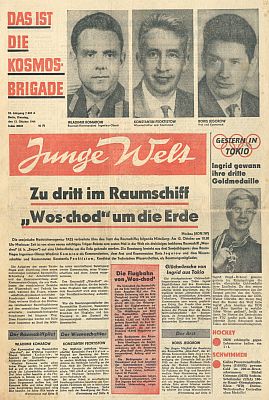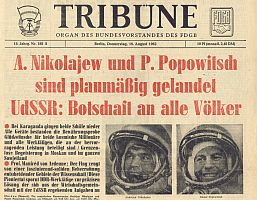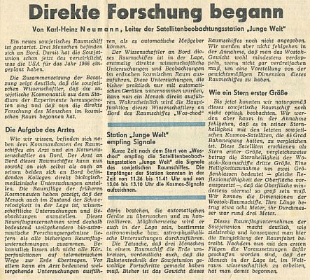 FSM-3 (Feld-Stärke-Messer) von RFT, mit einem Empfangsbereich von 87-300 MHz.Auf dem Dach des Verlagsgebäudes auf der Mohrenstraße 36/37, errichtete man eine Anlage für die visuelle bzw. optische Satellitenbeobachtung. Zur Ausstattung gehörten u.a. zwei AT-1 Fernrohre mit transportabeln Dreibeinstativen mit Zeitregistrierung für die Bahnspurfotographie. Neben den Satellitenbeobachtungen wurden auch astronomische Ereignisse fotografiert und die Aktivitätsperioden der Sonne überwacht. Da aber im Zentrum einer Großstadt wie Berlins, schlechte Bedingungen für optische Beobachtungen herrschen, konzentrierte man sich hauptsächlich auf die funktechnische Beobachtung. Am 20.Oktober 1967 besuchte der sowjetische Kosmonaut Andrijan Nikolajew die Satellitenbeobachtungsstation "Junge Welt". Nikolajew hatte vorher als fünfter Mensch vom 11.-15.August 1962 mit dem Raumschiff Wostok 3 einen 3tägigen Raumflug absolviert. |