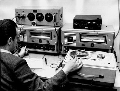 | Der Leiter der Satellitenbeobachtungsstation Karl-Heinz Neumann an den Allwellenempfängern Dabendorf. |