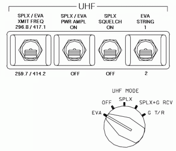 mW an Sendeleistung ist. Nach dem Start der STS-126 einer weiteren Mission des Space Shuttle Endeavour, war uns ein weiteres Mal beim ersten Umlauf ca. 20 Minuten nach dem Start aufgefallen, daß scheinbar wieder nur die Low-Power Leistung zur Verfügung stand. Damals hatte sich die NASA darüber aber nicht geäußert, ob das gewollt oder ungewollt geschehen war. Aus diesem Grund hatte ich mich mal näher mit den Schaltern im Shuttle Cockpit beschäftigt. Das UHF Kommunikationssystem wird in den Space Shuttles vom Schalt-Panel O6 aus gesteuert. Dieses befindet sich an der Decke des Cockpits, in der Reichweite des linken Sitzes des Kommandanten. Es wird bedient mit insgesamt 4 Kippschaltern und 1 Wahlschalter. Mit dem Kippschalter SPLX/EVA XMIT FREQ kann man jeweils zwischen den beiden analogen Frequenzen (primär 259.7 und sekundär 296.8 MHz) für den Space-to-Ground und den digitalen Frequenzen (primär 414.2 und sekundär 417.1 MHz) für das SSER/SSCS System wählen. Mit dem Kippschalter SPLX/EVA PWR AMPL wird der Sendeverstärker aktiviert. Wenn der Kippschalter in der [ON] Stellung steht, ist der Verstärker eingeschaltet und die Sendeleistung des UHF Kommunikationssystems auf High-Power. Das bedeutet bei den analogen A/G Frequenzen 10 Watt und beim SSER/SSCS System 5 Watt. In der Stellung [OFF] ist der Verstärker ausgeschaltet und der UHF-Sender im Low-Power, so das die Sendeleistung dann nur jeweils 0,25 Watt beträgt. Der Kippschalter SPLX SQUELCH ist die Rauschsperre. Mit dem Kippschalter EVA STRING ist es möglich zwischen STRING 1 und STRING 2 zu wechseln. Der Wahlschalter UHF MODE hat die 5 Stellungen: EVA, OFF, SPLX, SPXL+G RCV und G T/R. In der Stellung EVA wird das SSER/SSCS System aktiviert. Bei der Stellung OFF, ist das komplette UHF Kommunikationssystem deaktiviert. Die Stellung SPLX aktiviert die analogen A/G Frequenzen. In der Stellung SPXL+G RCV ist zusätzlich die Notruf-Frequenz 243.0 MHz auf Empfang geschaltet. Bei der Stellung G T/R kann man nur auf der Notruf-Frequenz 243.0 MHz senden und empfangen.