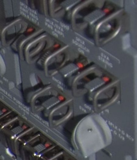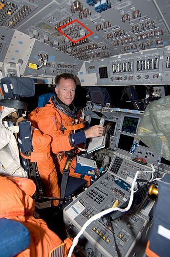 Das linke Foto zeigt den Kommandanten Chris Ferguson der Mission STS-126 auf seinen Platz im Cockpit. Er trägt noch seinen Druckanzug. Auch sieht es so aus als die Sitze hinter ihm noch aufgestellt waren. Daher nehme ich an, daß dieses Foto nur kurze Zeit nach dem Start aufgenommen worden war. Auf dem Foto hat man von mir rot markiert, einen guten Blick auf das Schalt-Panel O6 für die UHF Kommunikation. Auf dem anderen Foto rechts wo man den Ausschnitt stark vergrößert sehen kann, ist der Wahlschalter UHF MODE in der Stellung [OFF]. Somit war das UHF Kommunikationssystem zu dem Zeitpunkt deaktiviert gewesen. Interessant ist aber, daß der Kippschalter SPLX/EVA PWR AMPL auch in der Stellung [OFF] steht. Was bedeutet das der Verstärker deaktiviert war und man sich wie vermutet im Low-Power befand.